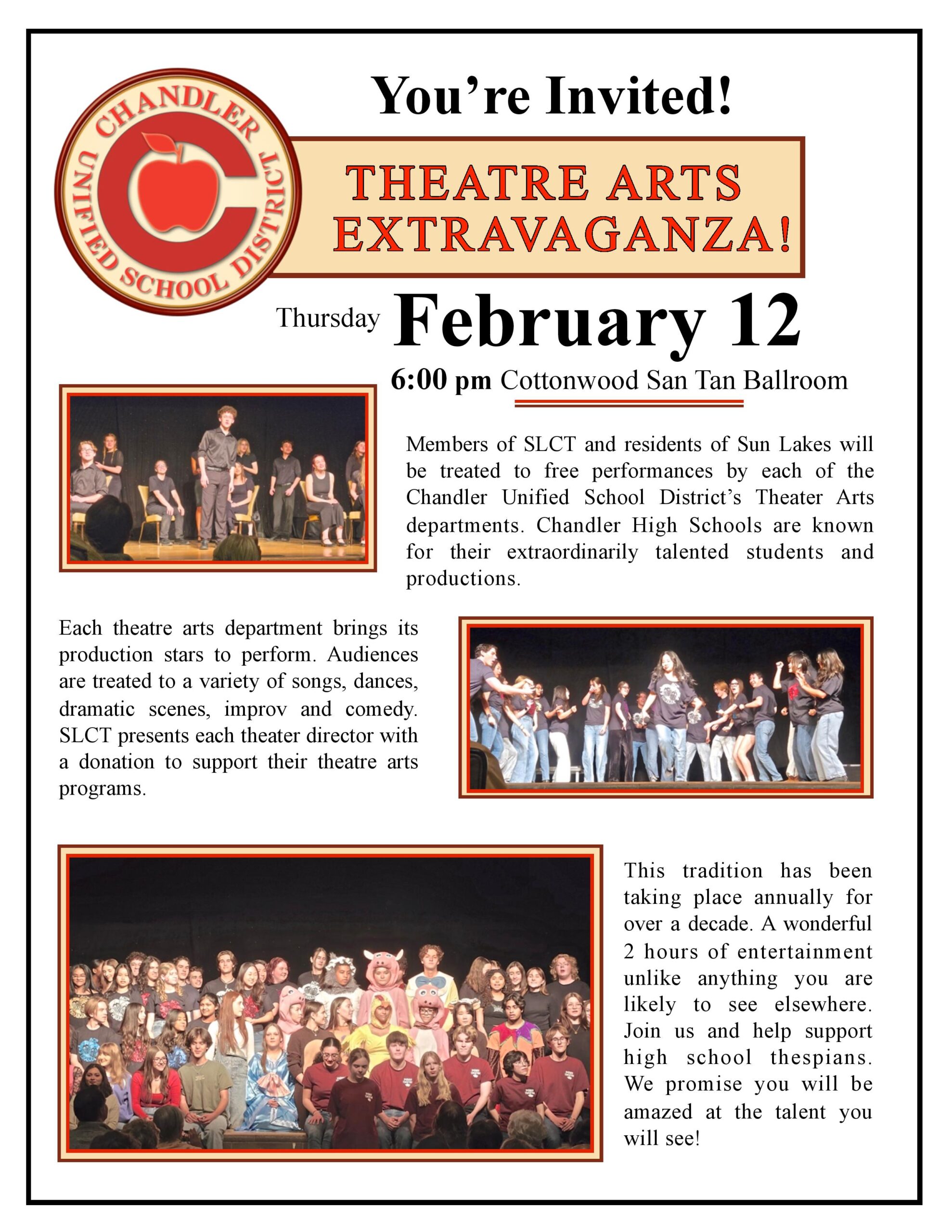 THE SUN LAKES COMMUNITY THEATRE STRIVES TO GIVE A DIVERSE AUDIENCE THE EXPERIENCE OF LIVE STAGE PLAYS AND IMPROVISATIONAL COMEDY WHILE SUPPORTING LOCAL SCHOOLS